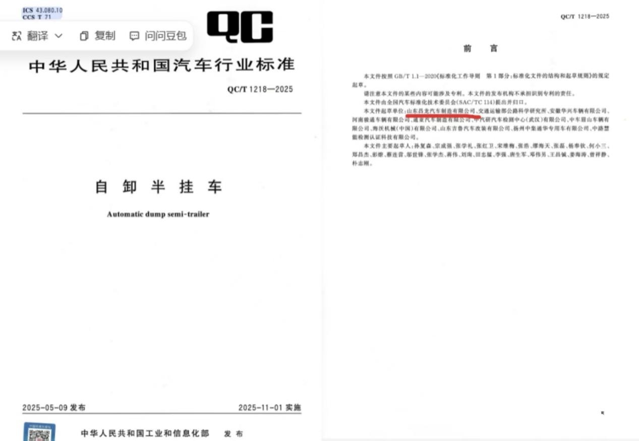 填補(bǔ)空白!昌龍掛車主導(dǎo),我國(guó)自卸半掛車首部行業(yè)標(biāo)準(zhǔn) 11 月實(shí)施