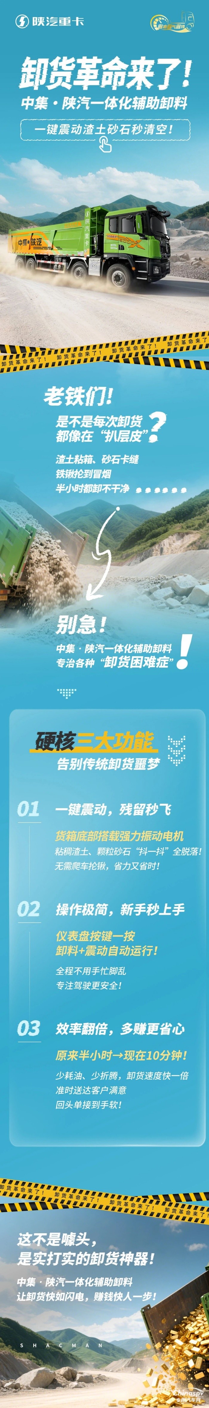 卸貨革命來了!中集•陜汽一體化輔助卸料,一鍵震動渣土砂石秒清空!