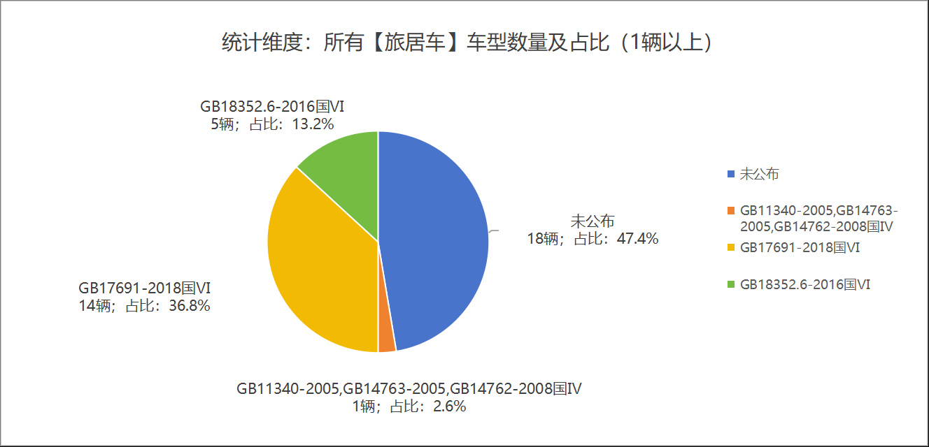 本次公告中的38款旅居車中,GB11340-2005,GB14763-2005,GB14762-2008國Ⅳ(1輛,占比2.6%)、GB17691-2018國Ⅵ(14輛,占比36.8%)、GB18352.6-2016國Ⅵ(5輛,占比13.2%)、未公布相關(guān)數(shù)據(jù)(18輛,占比47.4%)。