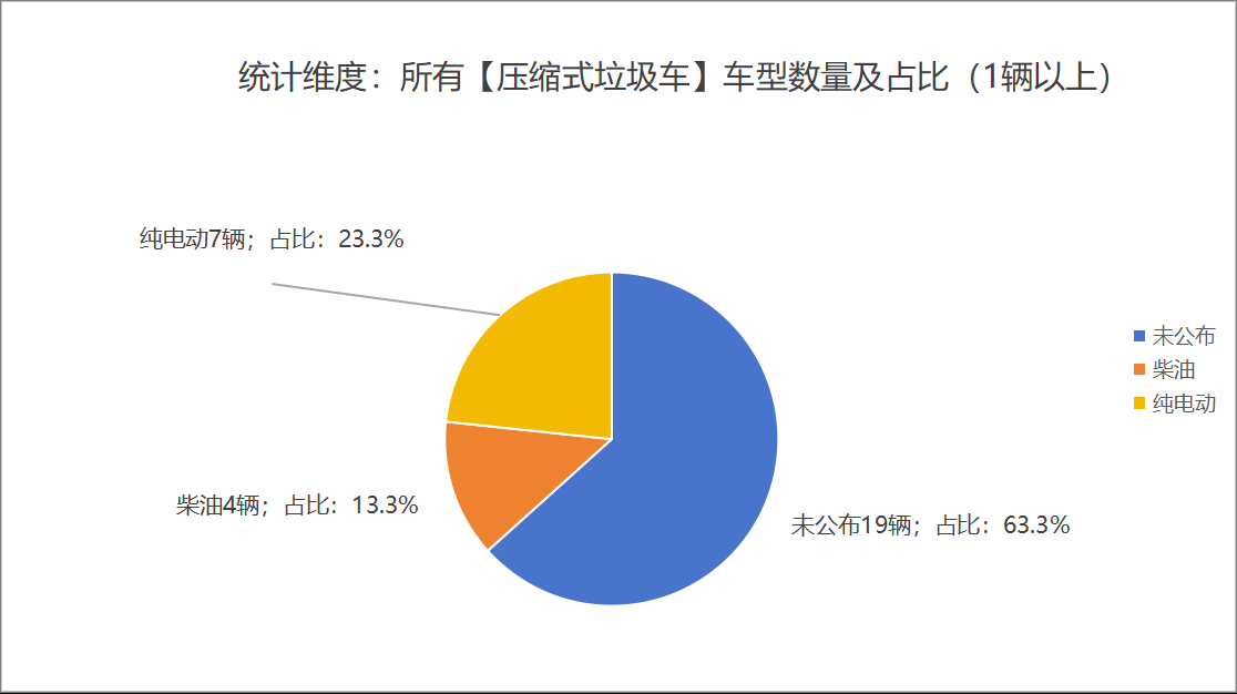 本次公告中的30款垃圾車中,柴油(4輛,占比13.3%)、純電動(7輛,占比23.3%)、未公布相關數(shù)據(jù)(19輛,占比63.3%)。