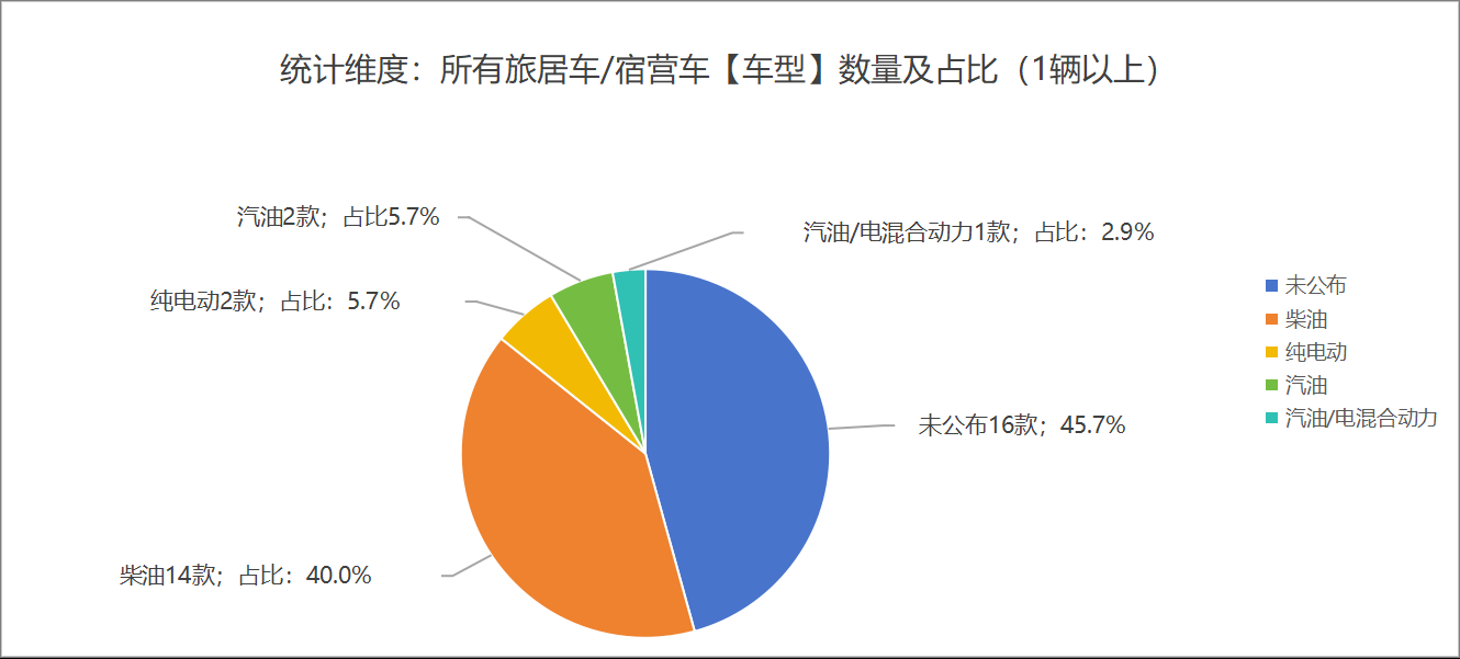 本次公告中的35款旅居車中,柴油(14輛,占比40.0%)、汽油/電混合動(dòng)力(1輛,占比2.9%)、純電動(dòng)力(2輛,占比5.7%)、汽油(2輛,占比5.7%)未公布相關(guān)數(shù)據(jù)(18輛,占比47.4%)。