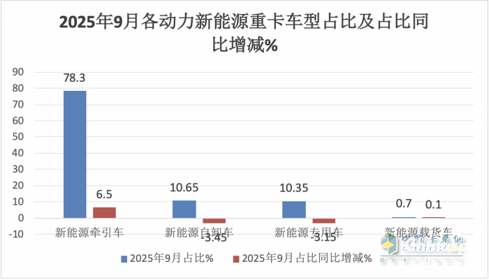上圖表可見,在2025年9月各類新能源重卡各個細分車型銷量同比、占比及占比同比增減中: