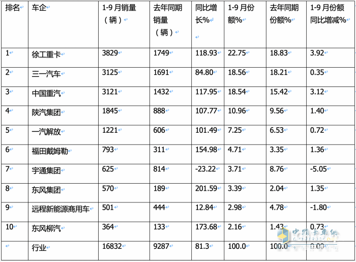 ----三一汽車及中國重汽這兩家車企累計銷量均超3000輛,分別居第二、第三。同比分別增長84.8%和117.95%,分別跑輸和跑贏大盤;市場占比分別為18.56%和18.54%;