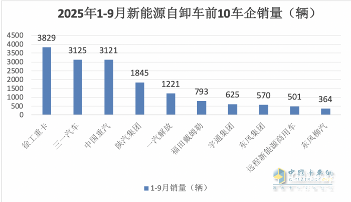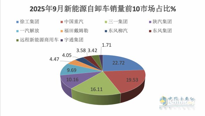上圖表可見,在2025年9月新能源自卸車市場中: