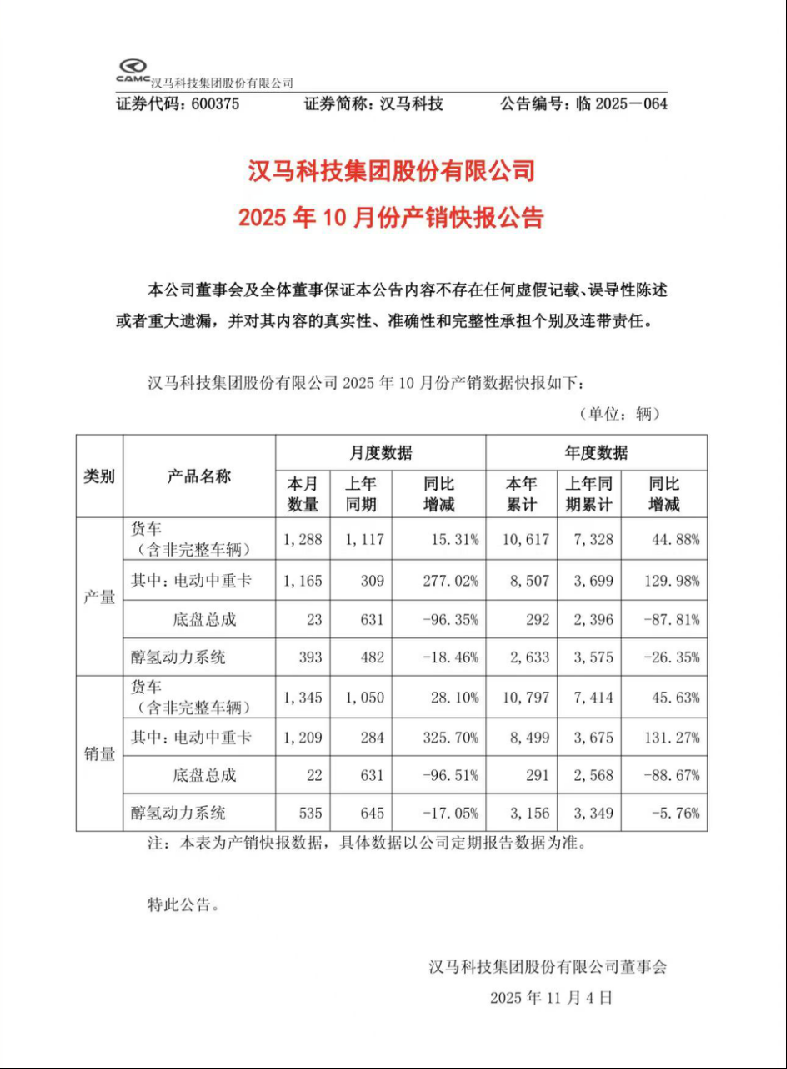2025年11月3日,漢馬科技發(fā)布2025年10月產(chǎn)銷(xiāo)快報(bào),新能源中重卡產(chǎn)銷(xiāo)同比分別增長(zhǎng)277.02%和325.7%,1-10月累計(jì)產(chǎn)銷(xiāo)同比分別增長(zhǎng)129.98%和131.27%,大幅領(lǐng)跑重卡市場(chǎng)。當(dāng)月?tīng)I(yíng)收預(yù)計(jì)突破6億元,創(chuàng)近5年來(lái)單月最佳成績(jī),彰顯了漢馬科技在新能源轉(zhuǎn)型戰(zhàn)略下的強(qiáng)勁發(fā)展勢(shì)頭,為企業(yè)實(shí)現(xiàn)高質(zhì)量發(fā)展注入強(qiáng)大信心。