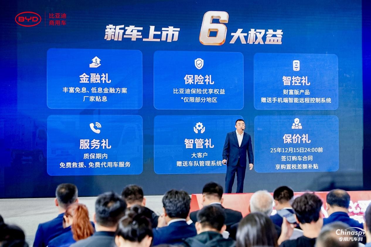 為賦能物流用戶,比亞迪同步推出 6 大上市權益涵蓋免息金融、保險優(yōu)享、免費贈送智能遠程控制系統(tǒng)、質保期免費救援和代用車服務、大客戶專屬車隊管理系統(tǒng)及購置稅報價補貼,覆蓋購車到運營全周期,助力低成本高效創(chuàng)富。同時,三電系統(tǒng)10年/80萬公里超長質保,為物流用戶打造低成本高效創(chuàng)富方案,推動行業(yè)綠色智能升級。