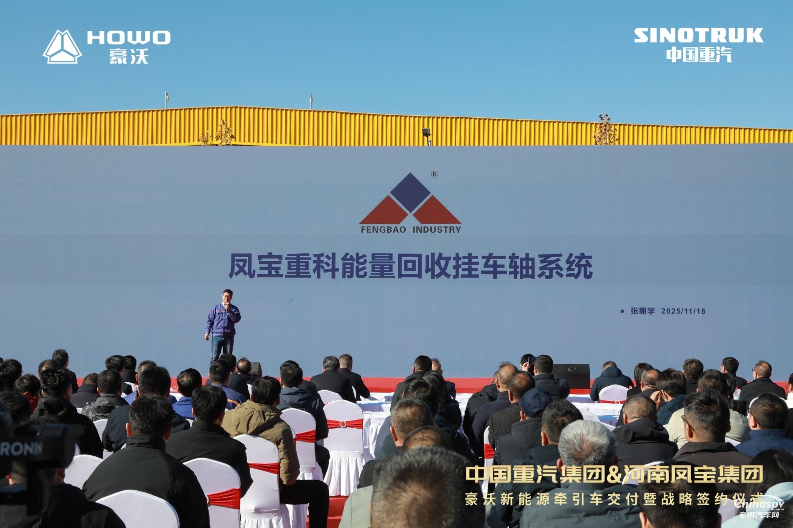2025 年 11 月 18日紅旗渠畔的鳳寶重科廠區(qū)內(nèi),中國重汽與河南鳳寶集團(tuán)舉行戰(zhàn)略合作簽約儀式,同時(shí)鳳寶重科的“新能源掛車發(fā)電軸動力系統(tǒng)”產(chǎn)品也在簽約儀式上首次發(fā)布。此次合作聚焦新能源商用車產(chǎn)業(yè)應(yīng)用,雙方將聯(lián)手打造區(qū)域領(lǐng)先的綠色運(yùn)輸裝備生態(tài),標(biāo)志著兩大企業(yè)在 “雙碳” 目標(biāo)指引下的深度協(xié)同正式啟動。