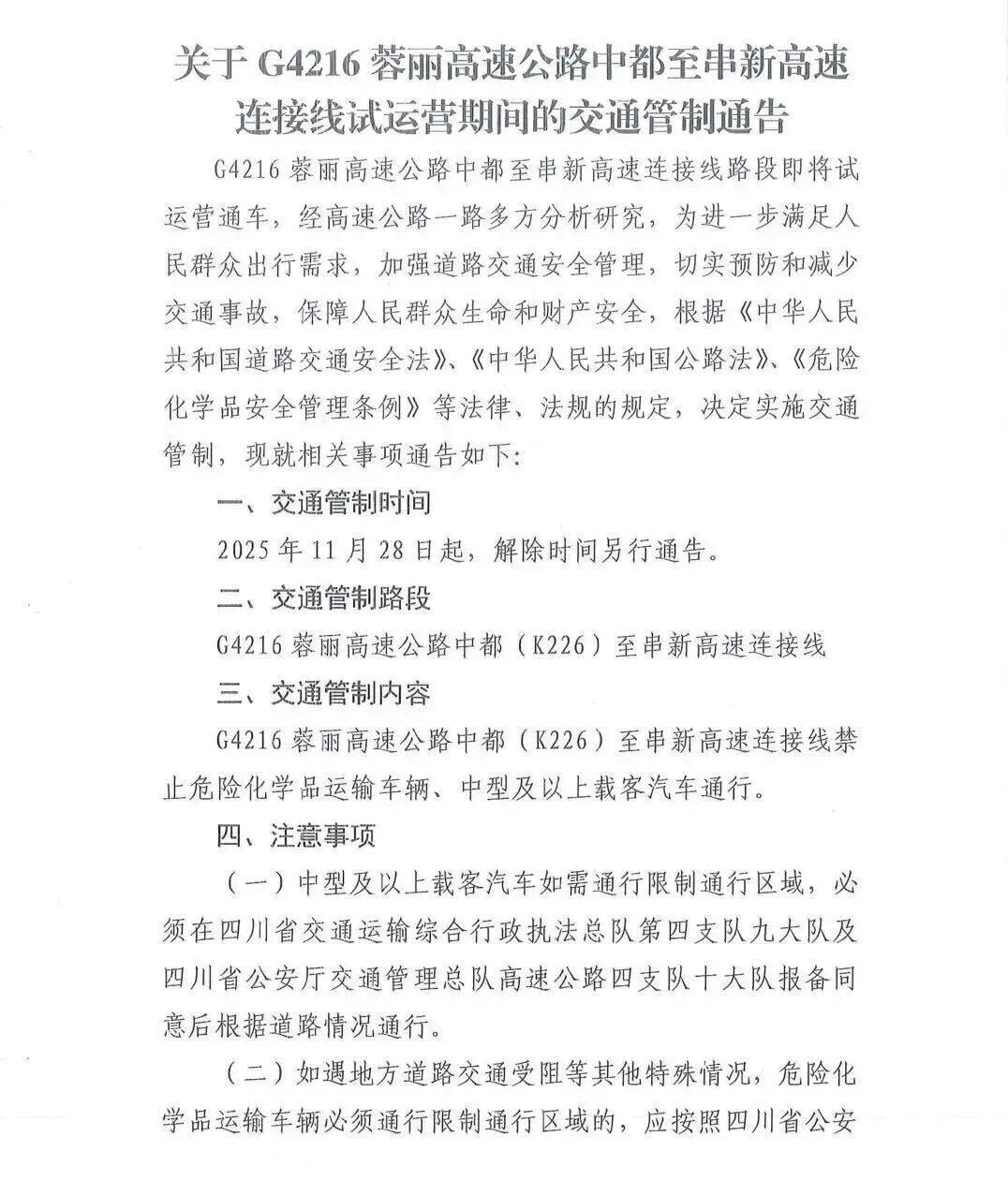 G4216蓉麗高速公路中都至串新高速連接線路段即將試運營通車,經(jīng)高速公路一路多方分析研究,為進一步滿足人民群眾出行需求,加強道路交通安全管理,切實預防和減少交通事故,保障人民群眾生命和財產(chǎn)安全,根據(jù)《中華人民共和國道路交通安全法》、《中華人民共和國公路法》、《危險化學品安全管理條例》等法律、法規(guī)的規(guī)定,決定實施交通管制,現(xiàn)就相關事項通告如下: