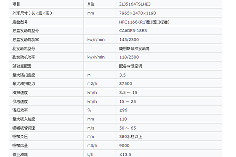 ZLJ5164TSLHE3型掃路車采用安徽江淮汽車股份有限公司HFC1166KR1T二類汽車底盤改裝,排放達(dá)到國Ⅲ標(biāo)準(zhǔn),副發(fā)動機(jī)采用康明斯柴油發(fā)動機(jī)。副發(fā)動機(jī)驅(qū)動風(fēng)機(jī)及各工作裝置,采用以吸為主、吸掃結(jié)合、干式除塵的工作原理對路面進(jìn)行清掃作業(yè),擁有“掃路車清掃裝置”、“掃路車除塵裝置”、“干、濕兩用吸掃式掃路車”等多項專利,整機(jī)技術(shù)水平處于國內(nèi)大型干式除塵掃路車領(lǐng)先地位,是我國干式除塵掃路車的開路先鋒,可與國外同類型掃路車媲美。