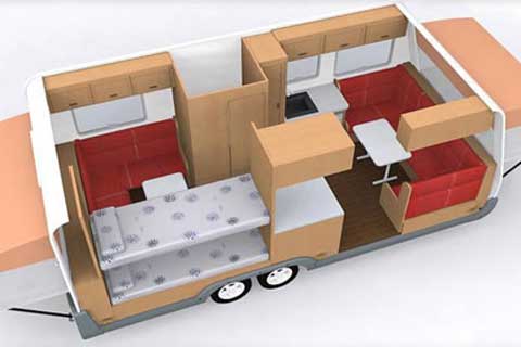 一款利用率極高的小型拖掛式房車。采用進口拖掛式房車專用底盤,配電制動及應急制動,確保行駛安全性。整體美式簡潔風格,結構精巧,安全輕便。內部空間靈活多變,可容納多達8-10人居住。前后外伸式雙人床配紗帳及防雨帳篷非常適合春夏之季棲息在大自然中、零距離感受自然界之美輪美奐。