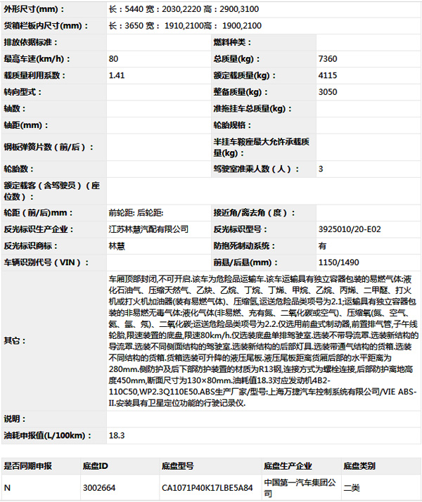 一汽解放牌CA5071XRQP40K17LE5A84易燃?xì)怏w廂式運(yùn)輸車