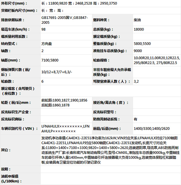 公告型號 CA5180XXYP62K1L7A1E5