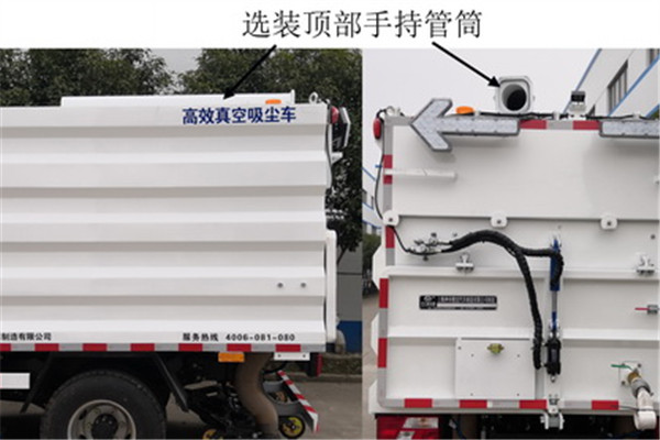 備注 隨底盤選裝黑色輪輞;裝有ABS,型號為: VIE ABS-II,生產(chǎn)廠家:浙江萬安科技股份有限公司;側、后防護裝置材質為Q235A,連接方式為螺栓連接,后防護裝置斷面尺寸100×48(mm),離地高度為390mm;選裝后滾刷吸口裝置時,后部滾刷吸口裝置替代后防護裝置,離地高度為280mm;專用裝置主要由清掃裝置和吸口、風機及動力系統(tǒng)、過濾裝置、垃圾倉等構成,主要功能為清掃吸塵、保潔作業(yè)。