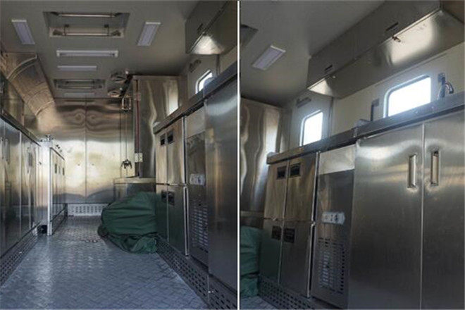 備注 1.頂部封閉,不可開啟;2.本車型裝備廚具,灶具等專用設施;3.側防護和后防護材料為Q345,采用螺栓連接,后防護截面尺寸180×40mm,離地高度405mm;4.ABS系統(tǒng)控制器型號為3631010-C2000,生產(chǎn)廠家為東科克諾爾商用車制動系統(tǒng)(十堰)公司.