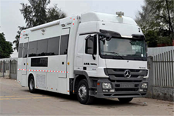 備注 左右側(cè)防護(hù)及后防護(hù)均為整體裙板結(jié)構(gòu),后防護(hù)離地高度為530mm.該車可選裝方形廂體,導(dǎo)流罩,后爬梯,后踏板,液壓升降尾板,液壓支撐系統(tǒng).車頂可選裝設(shè)備平臺,后艙空調(diào),探照攝像系統(tǒng),設(shè)備升降系統(tǒng)(可配套廣播、攝像、照明、探測、天線等設(shè)備),衛(wèi)星天線.車輛兩側(cè)及后部可選裝艙門,卷簾門,明窗,封閉車廂,LED顯示屏,遮陽棚.選裝液壓升降尾板時(shí)的整車長度為10200mm.選裝設(shè)備平臺、后艙空調(diào)時(shí)的整車高度為3625mm.選裝設(shè)備升降系統(tǒng)時(shí)的整車高度為3760mm.選裝衛(wèi)星天線時(shí)的整車高度為3950mm.選裝探照攝像系統(tǒng),設(shè)備升降系統(tǒng),衛(wèi)星天線,整備質(zhì)量分別為:13500kg,15000kg,16000kg.后車廂內(nèi)另外固定3-16個(gè)工作坐椅,只允許停車后供工作人員操作儀器和設(shè)備時(shí)使用.ABS型號: EB5003,生產(chǎn)廠家: WABCO.