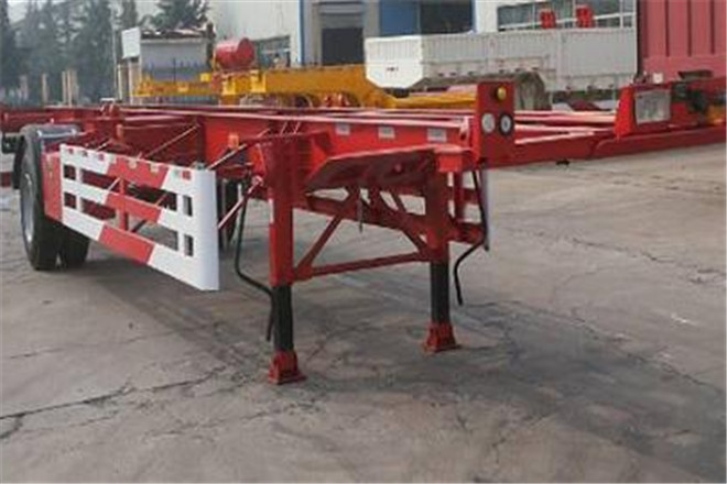 備注 此車為直梁骨架式結(jié)構(gòu),牽引銷處的車架高度90mm,160mm,194mm;此車僅可用于運輸40英尺或20英尺空載集裝箱;大梁可沖孔或不沖孔;因選裝引起整備質(zhì)量變化小于3%;ABS系統(tǒng)廠家為廣州市西合汽車電子裝備有限公司,型號為XH-GQ4S2M-E01;側(cè),后防護欄材料均為Q235或鋁合金材質(zhì),側(cè)防護的連接方式均為螺栓連接,后防護的連接方式為與車架焊接;后防護欄主要尺寸:斷面尺寸為160×50 mm,離地高度為500mm。