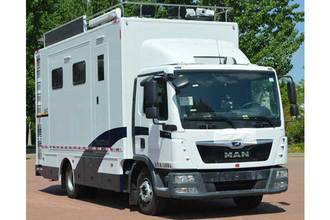 備注 頂部封閉,不可開啟;該車應(yīng)在側(cè)面和后部安裝車身反光標(biāo)識(shí);該車側(cè)防護(hù)為裙邊結(jié)構(gòu),側(cè)防護(hù)最下部離地高度為370mm,后防護(hù)最下部離地高度為400mm. 材料為Q235A,結(jié)構(gòu)為2300mm×60mm×120mm;升降照明燈高為3935mm,LED屏高為3915mm,護(hù)欄高為3810mm.ABS型號(hào):480020XXX0 ,生產(chǎn)廠:WABCO;專用裝置:指揮控制系統(tǒng)、傳輸系統(tǒng)、機(jī)柜等;發(fā)動(dòng)機(jī)最大凈功率為184kw;