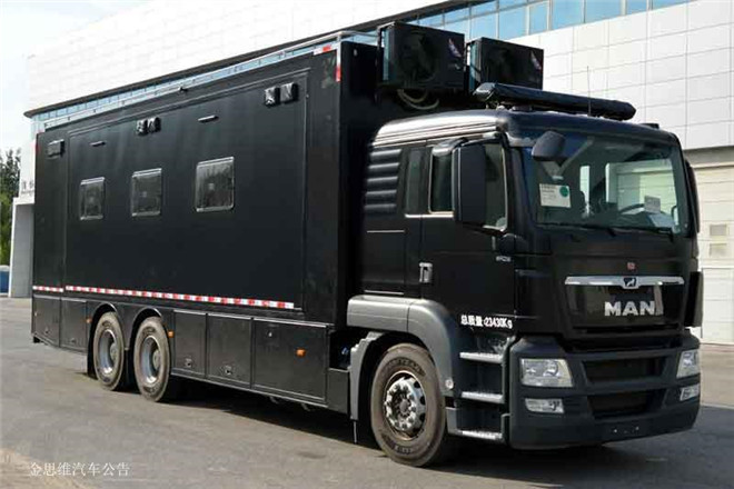 備注 頂部封閉,不可開啟;側防護為裙邊結構,側防護離地高390mm,后防護離地高度為470mm. 側防護及后防護:材質Q235,連接方式:螺栓連結,后部長*寬*高為2394mm×60mm×120mm;ABS型號:0 486 106,生產廠:KNORR;發(fā)動機最大凈功率為353kw.專用裝置:宿營床,空調,發(fā)電機電視,物品柜等,用于野外宿營。