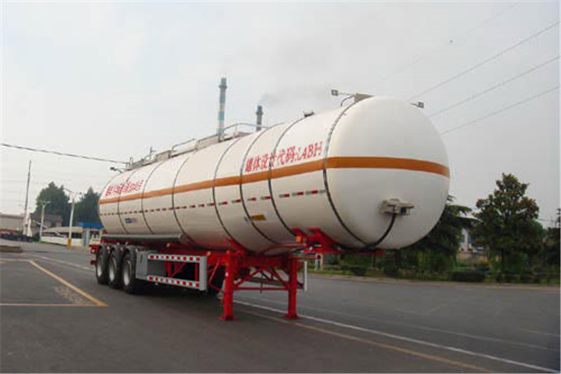 備注 罐體有效容積43.8立方米,罐體總?cè)萘?6立方米.罐體外形尺寸( mm):保溫外罐長:12610外徑前φ2360/后φ2460; 內(nèi)罐:長12430外徑前φ2160/后φ2260.危險貨物運輸車輛的類型為:FL型,準運介質(zhì)的最大密度為693千克/立方米.該車裝空氣懸架,選裝側(cè)面防護裝置、擋泥板.爬梯可在罐體前部或后部或前后都裝.選裝滅火器安裝位置及樣式.選裝集液槽數(shù)量及位置、罐頂走道、護欄樣式 選裝握手盒結(jié)構(gòu),選裝分段裝配式大梁和T型梁結(jié)構(gòu)、支腿支架樣式、側(cè)防護支架樣式,選裝軟管存放箱、側(cè)面結(jié)構(gòu)及穿線管.選裝后部上橫梁結(jié)構(gòu)、材料及牌照板位置,選裝蒙皮、深淺封頭及燈支架,選裝正前、正后爬梯及頂部燈支架新結(jié)構(gòu).選裝側(cè)面尾部操作箱、側(cè)面工具箱樣式、尾部標志板安裝位置.ABS廠家、型號:威伯科(上海)管理有限公司,4005000880或廣州瑞立科密汽車電子股份有限公司,CM2XL-4S/2K(4S/2M)或浙江萬安科技股份有限公司,VIE-TABSⅡ或廣州市西合汽車電子裝備有限公司,XH-GQ4S2M-E01或翰德汽車產(chǎn)品(蘇州)有限公司,364570001.EBS廠家、型號:克諾爾商用車系統(tǒng)企業(yè)管理(上海)有限公司,K11061XVXX或瀚德汽車產(chǎn)品(蘇州)有限公司,4S2M或威伯科(上海)管理有限公司,4801020640或浙江萬安科技股份有限公司,VIE TEBS-I或廣州瑞立科密汽車電子股份有限公司,CM-TEBS.側(cè)防材料為鋁合金,螺栓連接;后防材料為Q235或鋁合金,螺栓連接,斷面尺寸80mm×150mm,后防護材料為Q235,螺栓連接.后防護斷面尺寸65×150mm,離地高495mm.采用適用于牽引危險品運輸半掛車的牽引車.