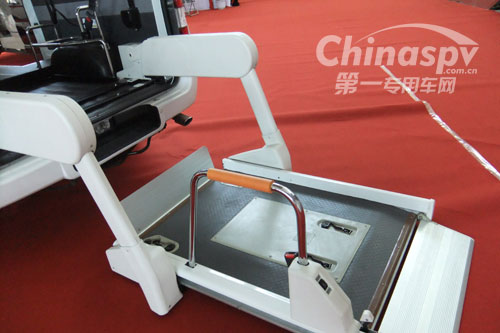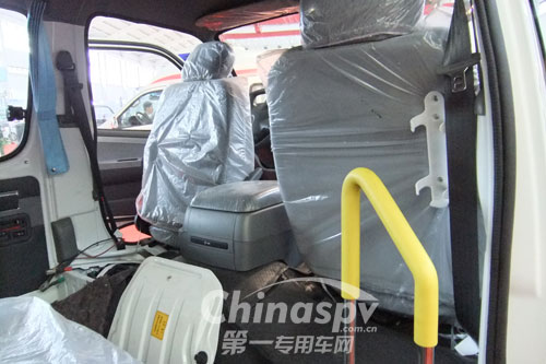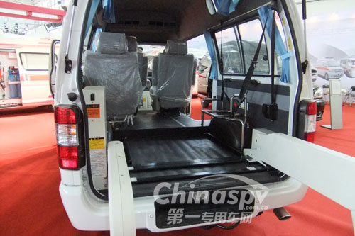 前排2個人單人旋轉(zhuǎn)座椅,后排單人座椅,木質(zhì)抬高地板+專用地板鋪面,電動液壓輪椅升降機(jī)構(gòu),輪椅固定支架,拉門上車扶手,側(cè)窗窗簾